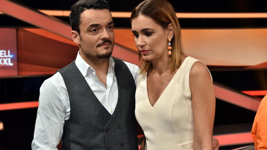 Kerner and jana ina zarrella are seen on stage with the final donation check during the ein herz fuer kinder gala at studio berlin adlershof on december 05, 2020 in berlin, germany.